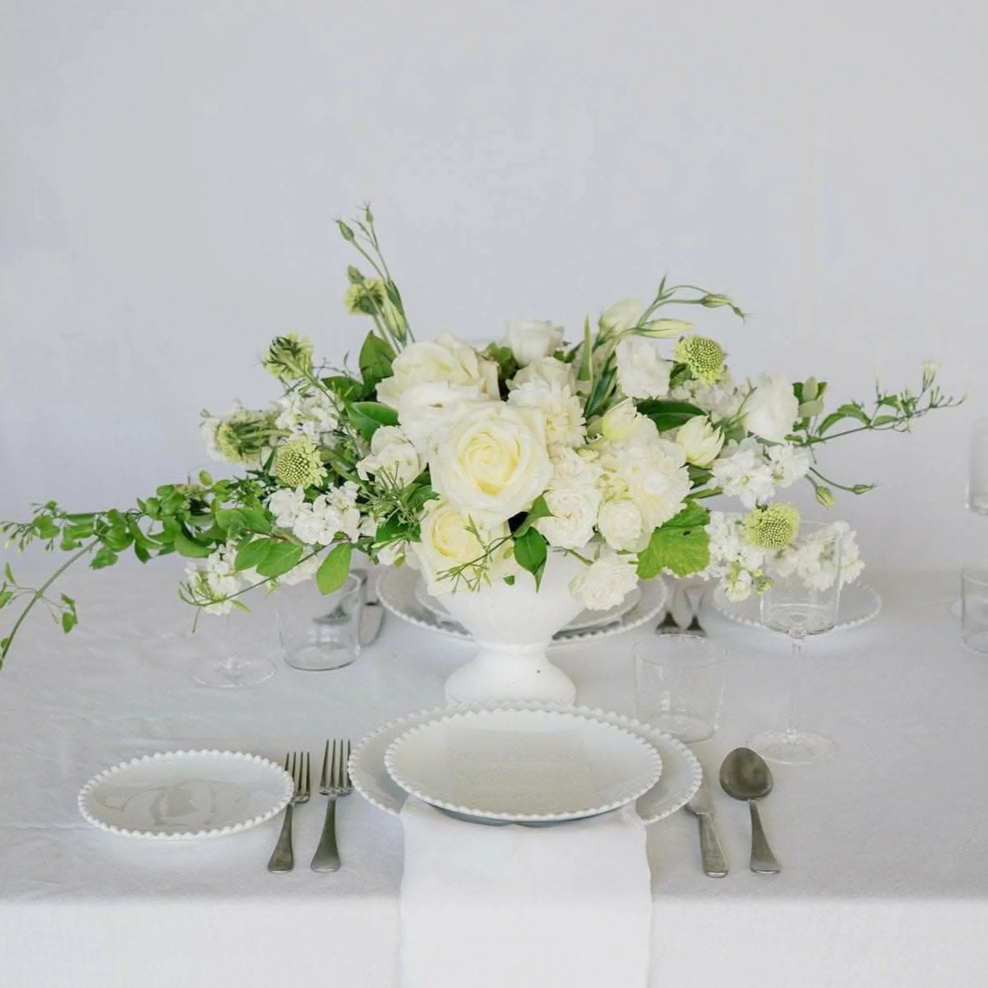 Artificial floral centerpiece; table-ready and consistent across setups.
